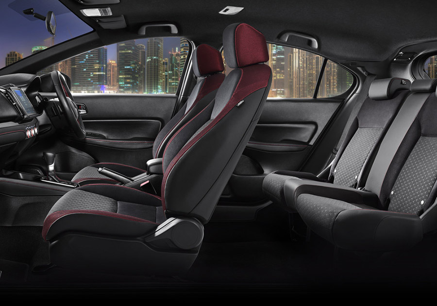 Kabin yang lapang pun disertai dengan jok yang dilapisi dengan Suede-Fabric-Leather Combi Trimmed Seats yang diberikan aksen merah yang menghadirkan kenyamanan berkelas serta sensasi mobil yang lebih sporty. Tak hanya itu, area kabin juga dirancang dengan fungsionalitas tinggi untuk memenuhi gaya hidup konsumen dan kebutuhan anak muda yang sangat dinamis. Kabin Honda City Hatchback RS menerapkan fungsi ULTRA Seat, di mana penumpang dapat mengatur 4 mode berbeda pada kursi depan dan belakang yang terdiri dari Utility Mode, Tall Mode, Refresh Mode, dan Long Mode.
